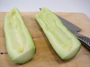 4. Salad: cut cucumbers into 1/2 inch slices. If you are using regular cucumbers, remove the seeds first. Can be cut hours before but don’t dress until ready to serve.