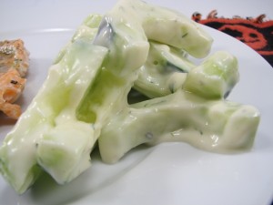 I changed the recipe a tiny bit again. I mixed the cucumber chunks with some yogurt sauce to lightly coat them–sort of like a thick dressing.