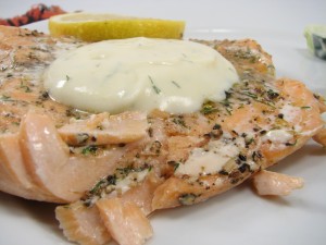 I stumbled upon this recipe in a memoir I was reading about an ex-pat living in Paris. I bookmarked the recipe because it sounded so good to me. I used to make something similar–with just a little butter, dill and slices of lemon–but I loved the addition of the yogurt sauce and cucumber. I knew the next time I was making salmon I’d try it this way.